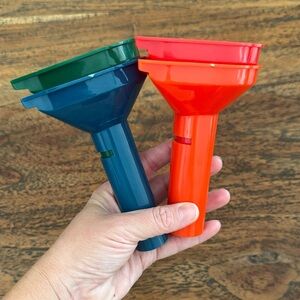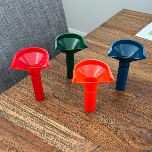 Set of four plastic coin sorting funnels in vibrant colors. Perfect for counting coins - pennies dimes quarters and nickels