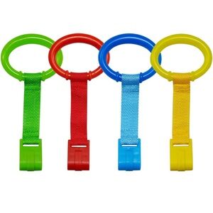 Set of 4 colorful plastic baby crib pull up rings. Includes yellow, green, red, and blue rings. Good Condition.