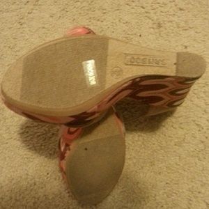 Brand new without box. Cream, coral and pink with a little burgundy, orange and brown crochet on the heel. Super cute and unique. Bought on a whim but never worn.