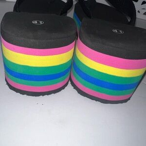 Vibrant platform sandals with a rainbow stripe. Comfortable black straps. Perfect for casual outings sz 41
