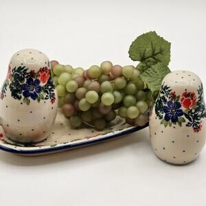 Colorful Handmade and Hand Painted Polish Pottery Salt and Pepper Set by Boleslawiec-Garden Party Pattern - No chips or cracks. Add a touch of stoneware charm to your dining table decor. 3.5"H x 4"w x 7"L. 3 pieces. Dishwasher and microwave safe.