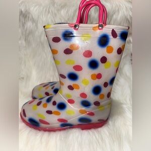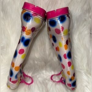Vibrant rain boots with multicolored polka dots. Perfect for adding a splash of color to rainy days.