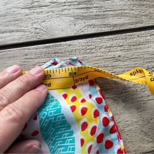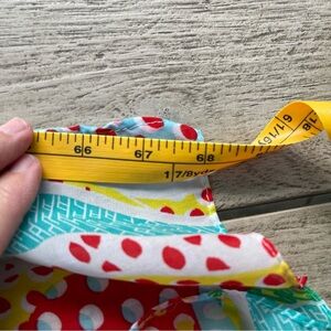 Vibrant scarf with polka dots and wave patterns. Features red, yellow, blue, and white colors.