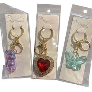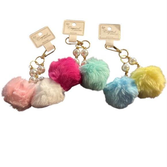 Set of colorful pom pom keychains. Features pink, white, blue, and yellow pom poms. Perfect for adding a fun touch to your keys or bag.