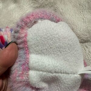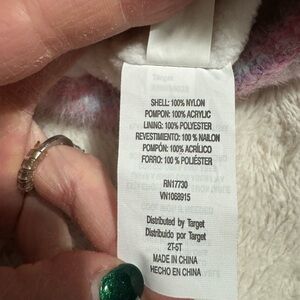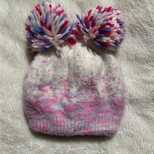 Keep your child cozy and stylish with this colorful pom-pom knit hat. Featuring a delightful mix of pink, white, and purple, it's perfect for adding a pop of color to any outfit.