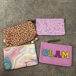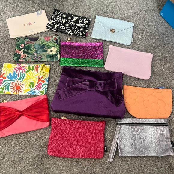 A vibrant collection of Ipsy pouches in various colors and patterns. Includes purple, pink, orange, and more.