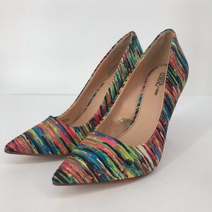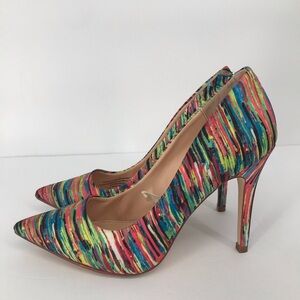 Satin material with lots bright colors! Classic silhouette with 4 inch heel. Only wear is on bottom. Still EUC! If you love lots of color, these are for you!