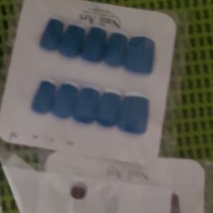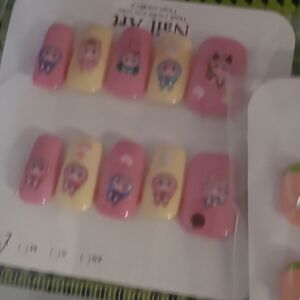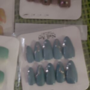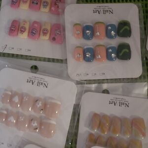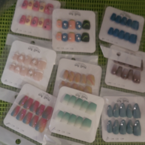 Explore a vibrant collection of press-on nails featuring shades of pink, blue, and green. Perfect for a quick and stylish manicure.