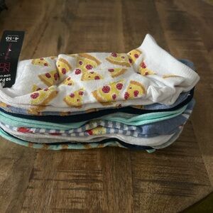 Fun socks with a pretzel pattern. Features a mix of colors including light blue and gold.