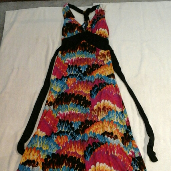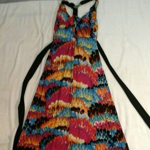 Halter top maxi dress with black waist straps. Measures 5 feet in length.