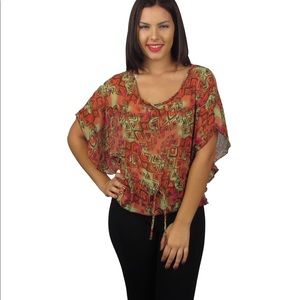 Beautiful colorful print top with drawstring waist. Color pink/green 100% Polyester