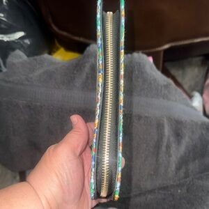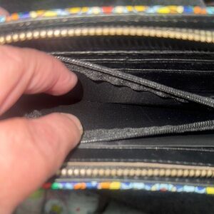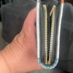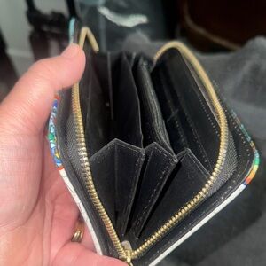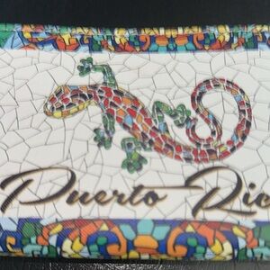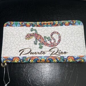Vibrant wallet featuring a mosaic lizard design and 'Puerto Rico' text. Multicolored with a white and mosaic trim background.
