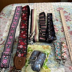 Set of vibrant purse straps with floral and geometric patterns. Includes red, pink, black, and blue designs. Perfect for adding style to your purse. All in bundle for price