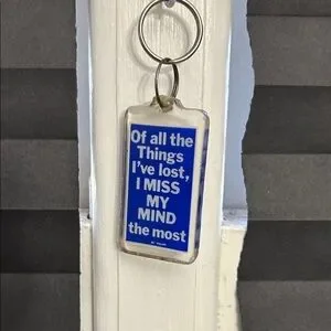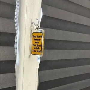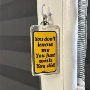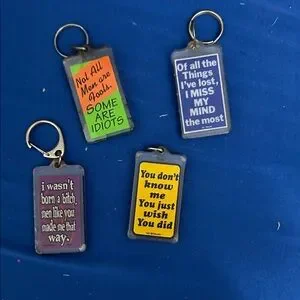 Set of four colorful keychains with humorous quotes. Perfect for adding personality to your keys.