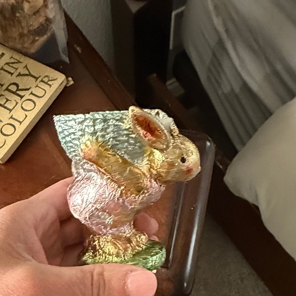 Foiled Charming rabbit figurine with vibrant colors hold an egg.Perfect for decor. One side ear chipped off.