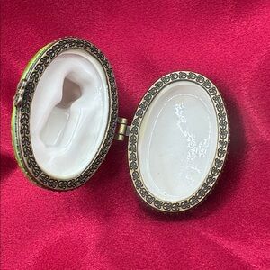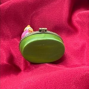 This item is a Limoges porcelain trinket box featuring a rabbit pushing a wheelbarrow with a baby rabbit inside. Often attributed to brands like Artoria or Nomoges, these are hand-painted porcelain boxes originating from Limoges, France. It includes intricate metalwork with an ornate brass clasp. The piece typically measures approximately 3 1/4”inches in height. Excellent condition, no marks.