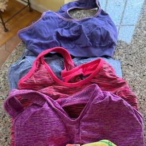 Set of 7 vibrant racerback sports bras in various colors. Perfect for workouts. Like new. No returns