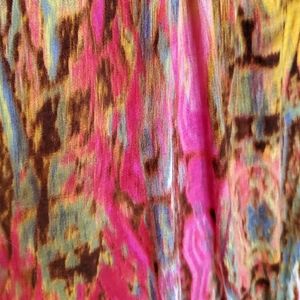 This bright tunic is great paired with jeans and sandals. Material is soft and lightweight. Solid material is dark brown. Excellent condition. Worn twice.