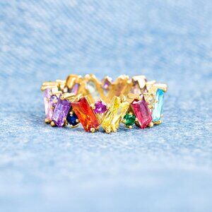 Colorful Rainbow Ring, Emerald Cut Eternity Band Rings for Women, 18K Gold Plate
