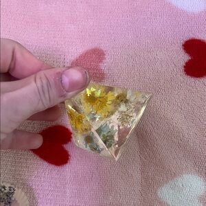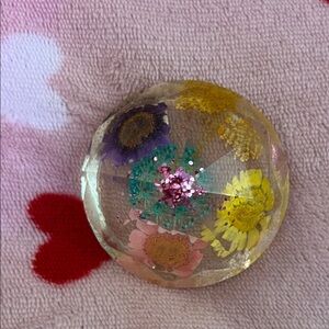 Set of colorful resin paperweights with floral designs. Includes various shapes and vibrant colors.