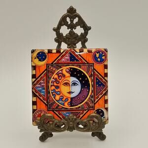 Beveled edges - Stunning colors. Measures 3-11/16 Square. No chips or cracks. Never used. STAND IS NOT INCLUDED. Enhance your table decor with this whimsical set of 4 Retro Boho Sun Face and Moon Face Coasters! Crafted from colorful ceramic with cork backing, these coasters are both stylish and practical. Bring a touch of celestial charm to your next gathering with these unique pieces!