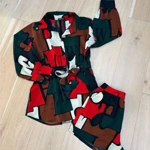 This vibrant set features a playful design with a mix of red, green, brown, and cream colors. Perfect for hot days and fun nights.
