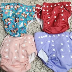 Discover the Reusable Diaper Set in vibrant colors. This set includes a playful blue pattern, a bold red, a soft pink, and a charming purple. Perfect for eco-conscious parents.