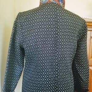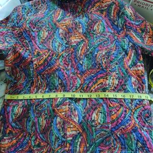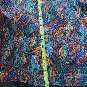 Two different patterns.. so much prettier in person..no size tag .. wear cuffs up or down on either side.. measurements in pics..multi colors on one side..no size or brand due to no tag..please ask questions before purchase..please measure a jacket you own for correct size