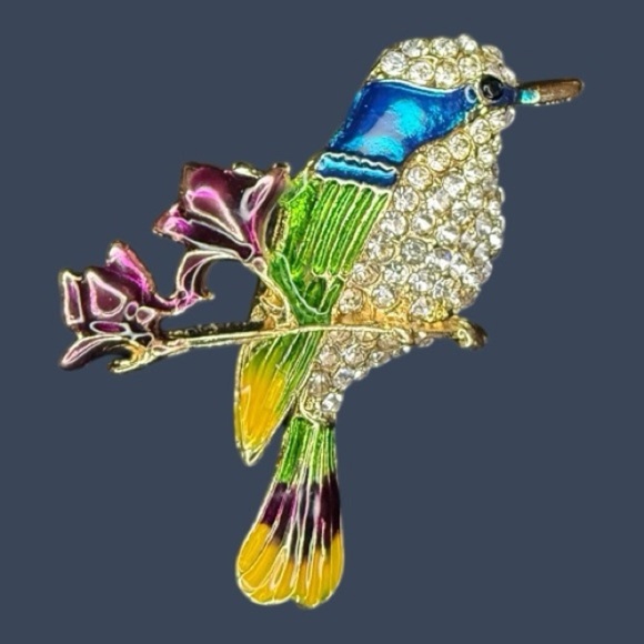Description: Stunning bird brooch with vibrant enamel details and rhinestones