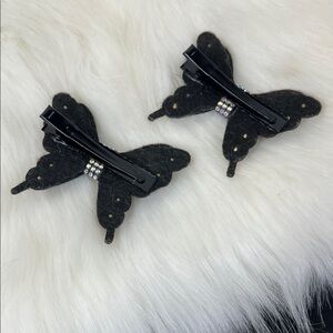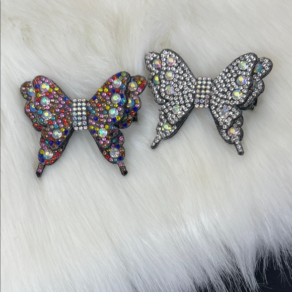Set of two butterfly hair clips adorned with colorful rhinestones. Perfect for adding sparkle to any hairstyle.
