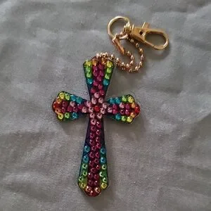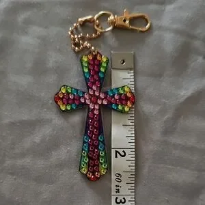 Add a pop of color to your accessories with this vibrant rhinestone cross keychain. Perfect for adding a touch of sparkle to your bag or keys. Double sided.