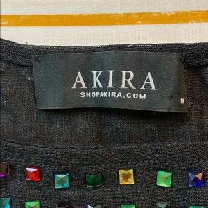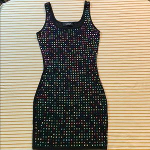 Black dress with multicolored rhinestones. A few stones are missing on both the front and back of dress but aren’t very noticeable.