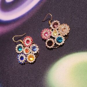 Add pop of colors & sparkle to your outfit with these stunning rhinestone earrings. Featuring vibrant hues of different multicolors, these earrings are perfect for any occasion and are versatile with any colour outfit. Gold tone fish hooks.