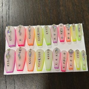 Vibrant false nails with rhinestone embellishments. Features pink, orange, and green hues.
