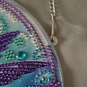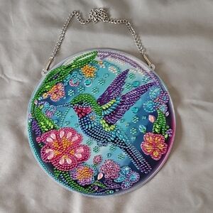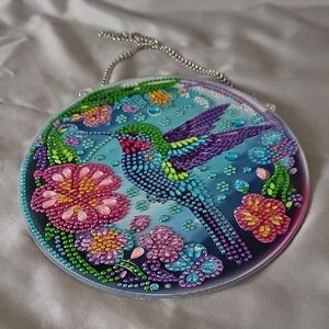 Vibrant rhinestone wall hanging featuring a colorful hummingbird and flowers. Includes a silver chain for hanging. Perfect for adding a splash of color to any room. Brand new with a protective film on the back.