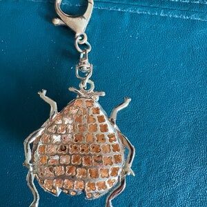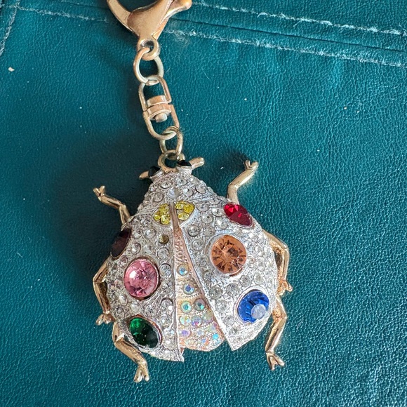 Sparkling ladybug bag charm adorned with multicolored rhinestones. Features red, pink, yellow, orange, blue, and green stones on a silver base.