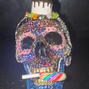 Vibrant skull decor adorned with multicolored rhinestones. Features a lollipop detail and a whimsical design.