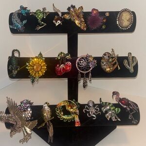 Sparkling sloth brooch adorned with multicolored rhinestones. Features orange, green, and silver tones. Perfect for adding a whimsical touch to any outfit. Each piece priced separately.