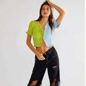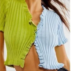 Vibrant ribbed green and blue ruffled short sleeve crop shirt featuring a unique color block design. Perfect for adding a pop of color to your wardrobe.