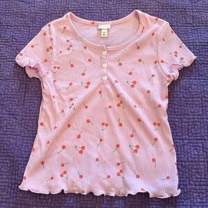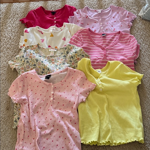 Set of ribbed t-shirts in various colors. Features heart, stripe, and floral patterns. Perfect for casual wear.