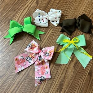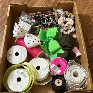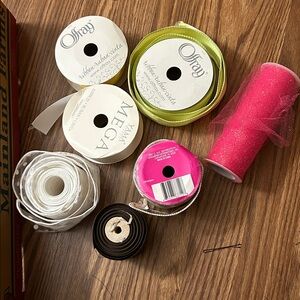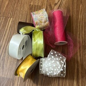 A vibrant assortment of ribbons and bows. Includes green, pink, white, and yellow colors. Perfect for crafts and gift wrapping.
