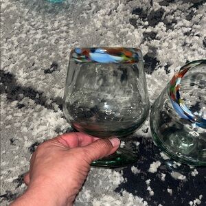 Set of two glass goblets with colorful rims. Perfect for any occasion.