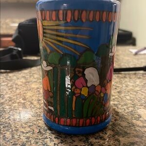 Vibrant mug featuring a Riviera Maya Mexico design. Bright blue handle with colorful artwork.