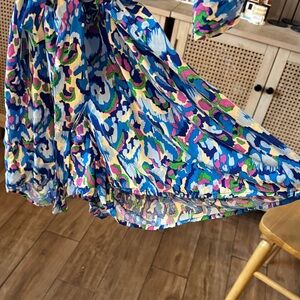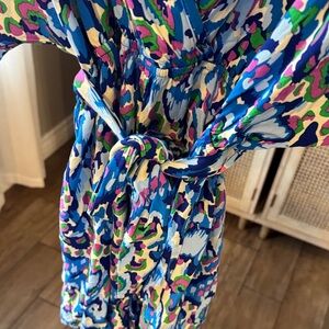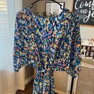 Vibrant romperwith a multicolor abstract pattern. Features a tie waist and flowing sleeves.