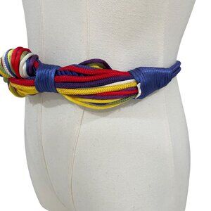 Make a bold statement with this unique handcrafted multicolor rope obi-style belt. This eye-catching piece features vibrant twisted cords in red, blue, yellow, green, white, and purple, artistically knotted in the front and secured at the back with a polished gold hook closure.