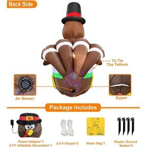 6 Ft Thanksgiving Inflatable Turkey: Thanksgiving decoration sitting inflatable turkey wears a Pilgrim hat. Package includes a 6 Ft turkey inflatable, 4 plastic ground stakes, 2pcs 6.6 Ft tethers, 1 water bag, 1 plug, and built-in blower