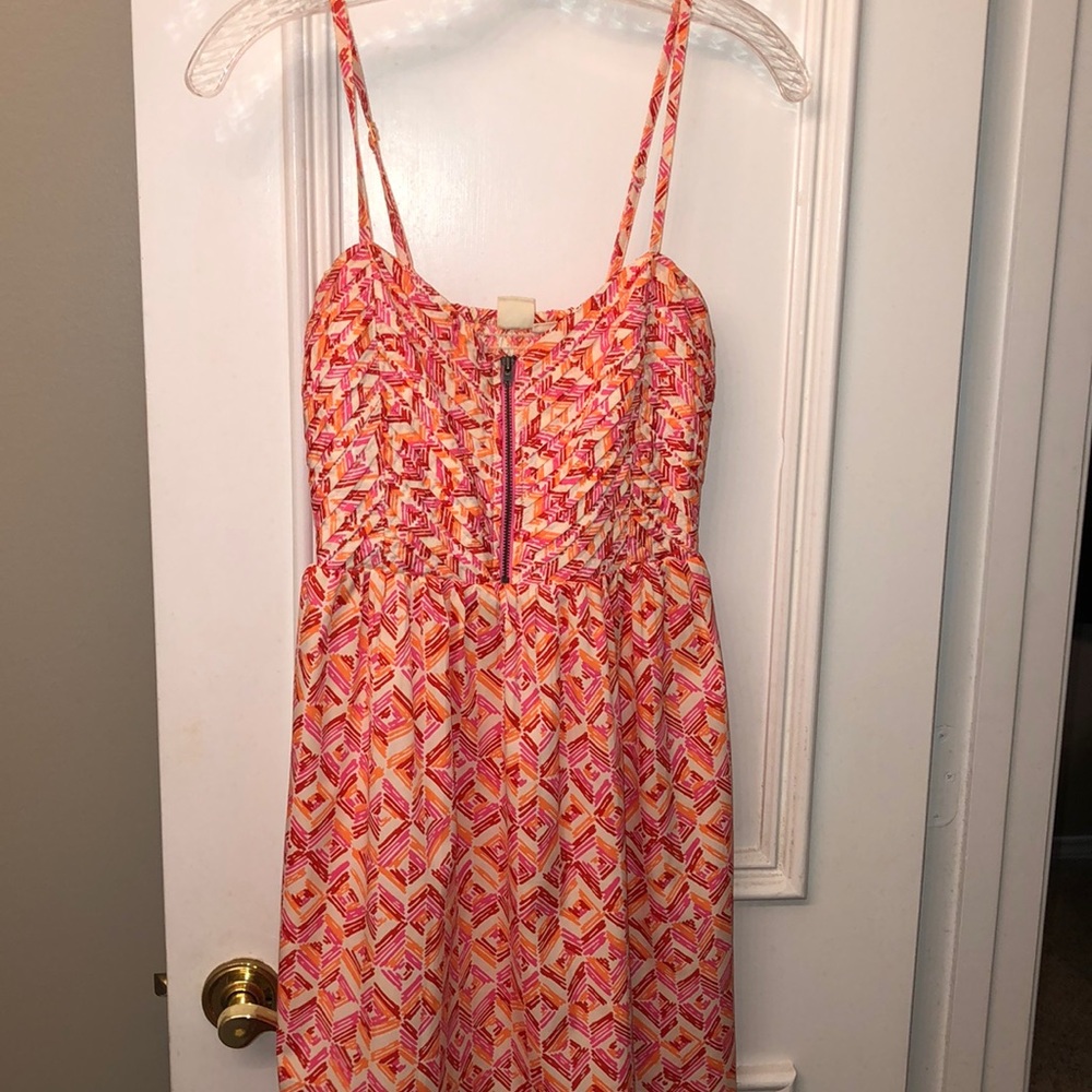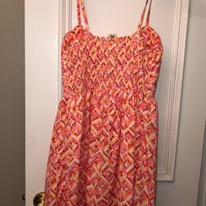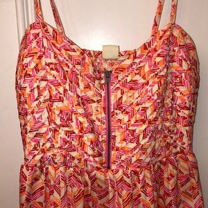 Dark pink pink and orange and white dress size small. Roxy brand. Zipper on chest and cinched material on chest area flowy on the bottoms. Adjustable straps