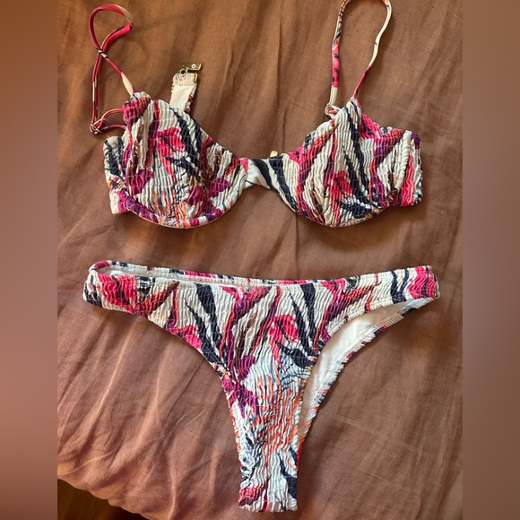 Vibrant bikini set with ruched texture. Features a mix of pink, purple, and blue colors.