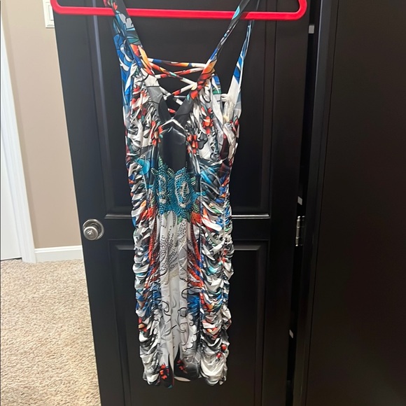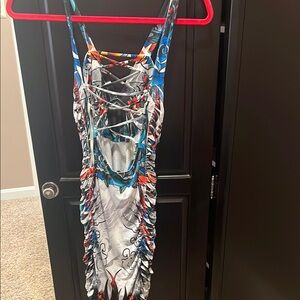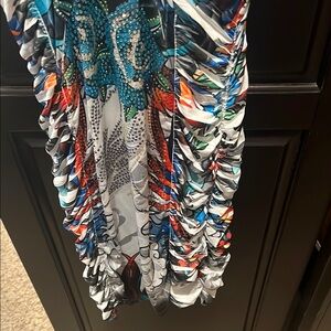 Vibrant ruched dress with a unique pattern. Features a mix of blue, orange, and black colors.