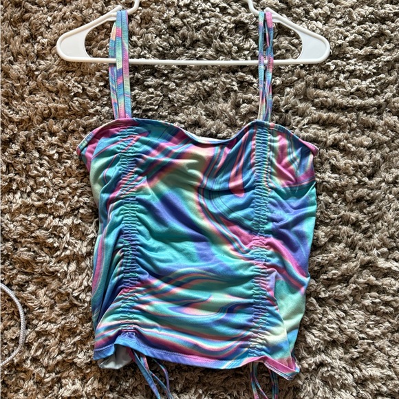 Vibrant ruched tank top with a swirl pattern. Features shades of blue, pink, and green.